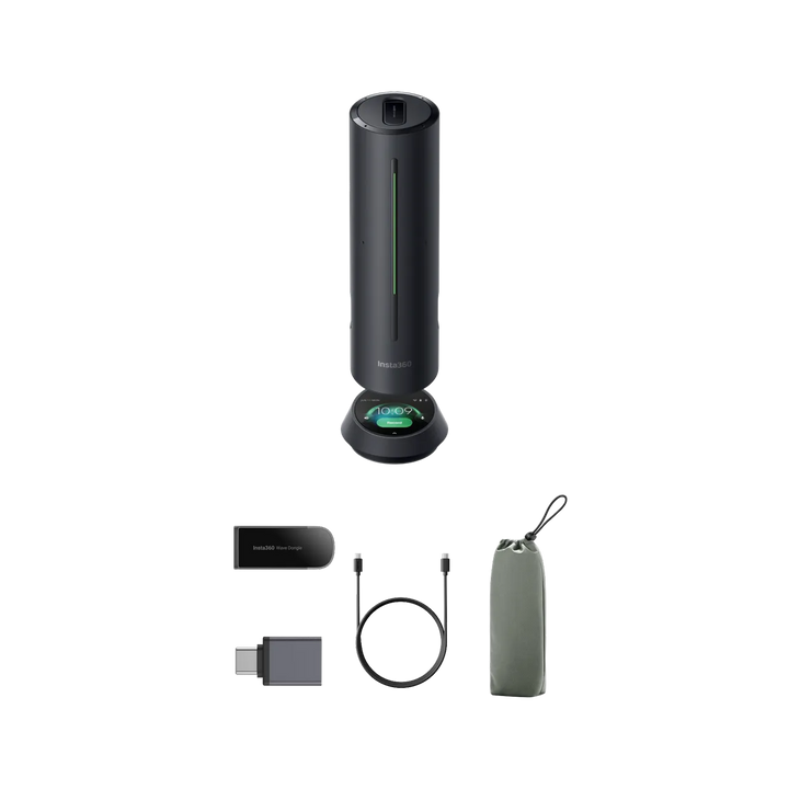 La Insta360 Wave no es una cámara, sino un altavoz inteligente con IA diseñado para reuniones, grabación de voz y transcripción automática. En la caja incluye el altavoz, cable de conexión, manuales y garantía. Debería traerlos porque garantizan que el usuario pueda usarlo de inmediato con todas sus funciones de audio profesional.
